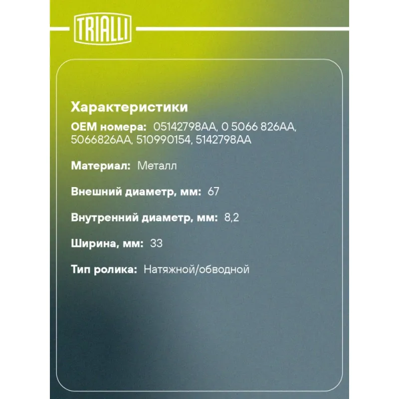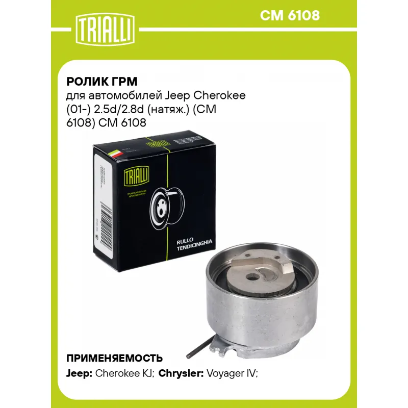 Ролик ГРМ для автомобилей Jeep Cherokee (01-) 2.5d/2.8d (натяж.) (CM 6108) Характеристики: Артикул: CM 6108 OEM номера: 05142798AA, 0 5066 826AA, 5066826AA, 510990154, 5142798AA Гарантийный срок: 2 года/60 000 км. Сопутствующий товар: Ролики ГРМ: CM 6203 Количество на автомобиль: 1 Материал: Металл Внешний диаметр, мм: 67 Внутренний диаметр, мм: 8,2 Ширина, мм: 33 Товарная линейка: BLACK Подходит для авто: Jeep Cherokee KJ (01-) Chrysler Voyager IV (01-) Для проверки применяемости отправьте VIN автомобиля через вкладку "Есть вопросы о товаре?" Комплектация: Ролик ГРМ - 1 шт Гарантия: от 1 года.