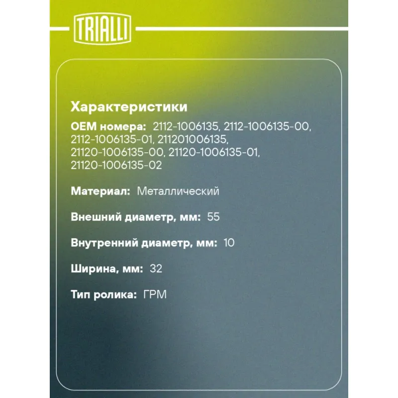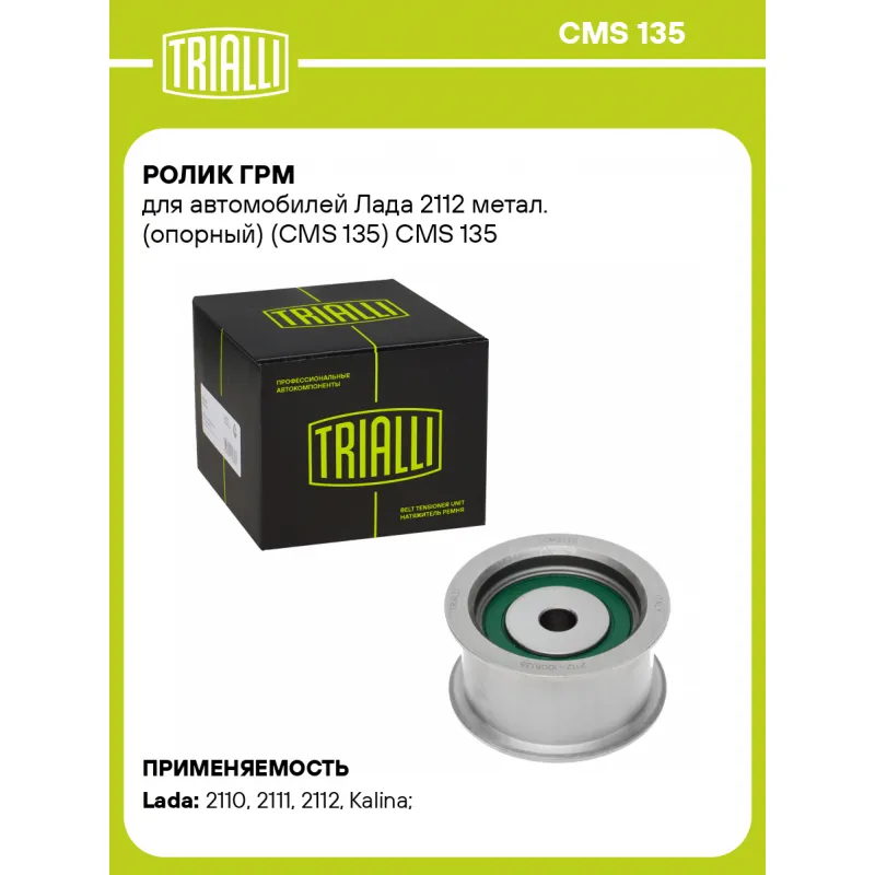 Ролик ГРМ для автомобилей Лада 2112 метал. (опорный) (CMS 135) Характеристики: Артикул: CMS 135 OEM номера: 2112-1006135, 2112-1006135-00, 2112-1006135-01, 211201006135, 21120-1006135-00, 21120-1006135-01, 21120-1006135-02 Количество на автомобиль: 1 Материал: металлический Особенности конструкции:: опорный Внешний диаметр, мм: 55 Гарантийный срок: 2 года/60 000 км. Внутренний диаметр, мм: 10 Ширина, мм: 32 Тип ролика: ГРМ Товарная линейка: PRO Сопутствующие товары:: CM 135, CM 120, CM S 120, GD 710, CM 712 Подходит для авто: ВАЗ 2110, 2110, 2111, 2111, 2112, 2112, 2110, 2111, 2112, Kalina (04-) Для проверки применяемости отправьте VIN автомобиля через вкладку "Есть вопросы о товаре?" Комплектация: Ролик ГРМ - 1 шт Гарантия: от 1 года.