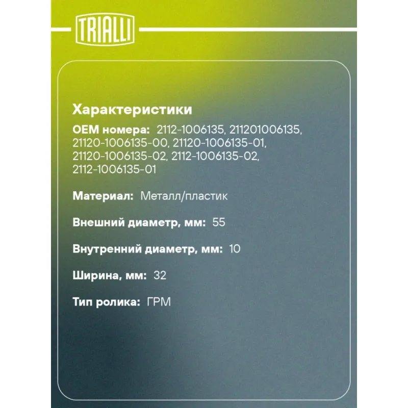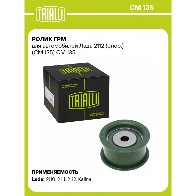 Ролик ГРМ для автомобилей Лада 2112 (опор.) (CM 135) Характеристики: Артикул: CM 135 OEM номера: 2112-1006135, 211201006135, 21120-1006135-00, 21120-1006135-01, 21120-1006135-02, 2112-1006135-02, 2112-1006135-01 Количество на автомобиль: 1 Материал: Металл/пластик Особенности конструкции:: опорный Внешний диаметр, мм: 55 Гарантийный срок: 2 года/60 000 км. Внутренний диаметр, мм: 10 Ширина, мм: 32 Тип ролика: ГРМ Товарная линейка: BLACK Сопутствующие товары:: CM S 135, CM 120, CM S 120, GD 710, CM 712 Подходит для авто: ВАЗ 2110, 2110, 2111, 2111, 2112, 2112, 2110, 2111, 2112, Kalina (04-) Для проверки применяемости отправьте VIN автомобиля через вкладку "Есть вопросы о товаре?" Комплектация: Ролик ГРМ - 1 шт Гарантия: от 1 года.