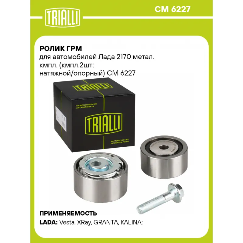 Ролик ГРМ для автомобилей Лада 2170 метал. кмпл. (кмпл.2шт: натяжной/опорный) Характеристики: Артикул: CM 6227 OEM номера: 21126-1006135, 21126-1006238, 21126-1006135-00, 21126-1006238-00 Гарантийный срок: 2 года/60 000 км. Количество на автомобиль: 1 Материал: Комбинированный Товарная линейка: BLACK Комплектация: Ролики ГРМ - 2 шт Гарантия: от 1 года.