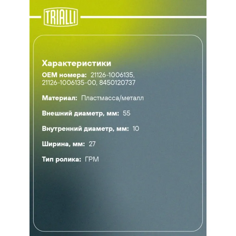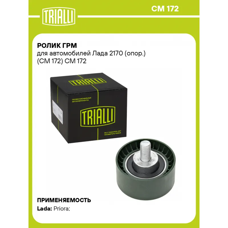 Ролик ГРМ для автомобилей Лада 2170 (опор.) (CM 172) Характеристики: Артикул: CM 172 OEM номера: 21126-1006135, 21126-1006135-00, 8450120737 Количество на автомобиль: 1 Материал: пластмасса/металл Особенности конструкции:: опорный Внешний диаметр, мм: 55 Гарантийный срок: 2 года/60 000 км. Внутренний диаметр, мм: 10 Ширина, мм: 27 Тип ролика: ГРМ Товарная линейка: BLACK Сопутствующие товары:: CM S 172, CM 138, CM S 138, GD 770, GD 612, CM 770 Подходит для авто: ВАЗ Priora (07-), Priora (07-), Priora (07-) Для проверки применяемости отправьте VIN автомобиля через вкладку "Есть вопросы о товаре?" Комплектация: Ролик ГРМ - 1 шт Гарантия: от 1 года.