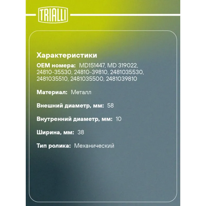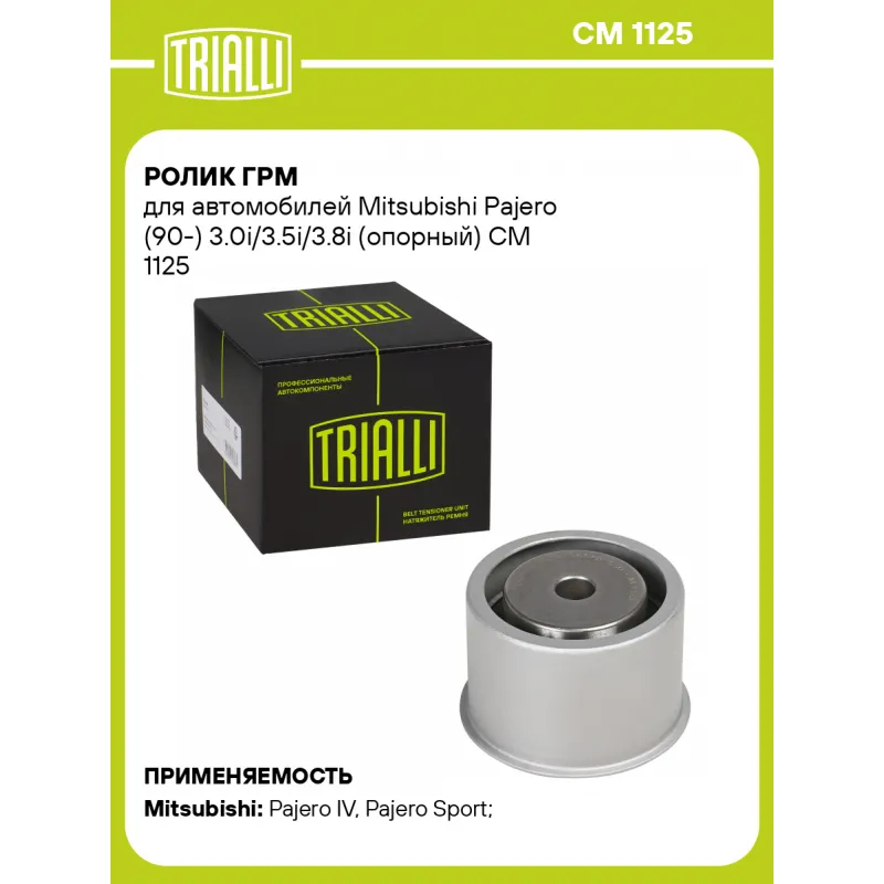 Ролик ГРМ для автомобилей Mitsubishi Pajero (90-) 3.0i/3.5i/3.8i (опорный) Характеристики: Артикул: CM 1125 OEM номера: MD151447, MD 319022, 24810-35530, 24810-39810, 2481035530, 2481035510, 2481035500, 2481039810 Сопутствующий товар: Ролики ГРМ: CM 1126 Количество на автомобиль: 1 Материал: металл Внешний диаметр, мм: 58 Гарантийный срок: 2 года/60 000 км. Внутренний диаметр, мм: 10 Ширина, мм: 38 Тип ролика: механический Товарная линейка: BLACK Подходит для авто: Mitsubishi Pajero IV (06-), Pajero Sport (08-), Pajero II (90-), Pajero III (00-) Для проверки применяемости отправьте VIN автомобиля через вкладку "Есть вопросы о товаре?" Комплектация: Ролик ГРМ - 1 шт Гарантия: от 1 года.