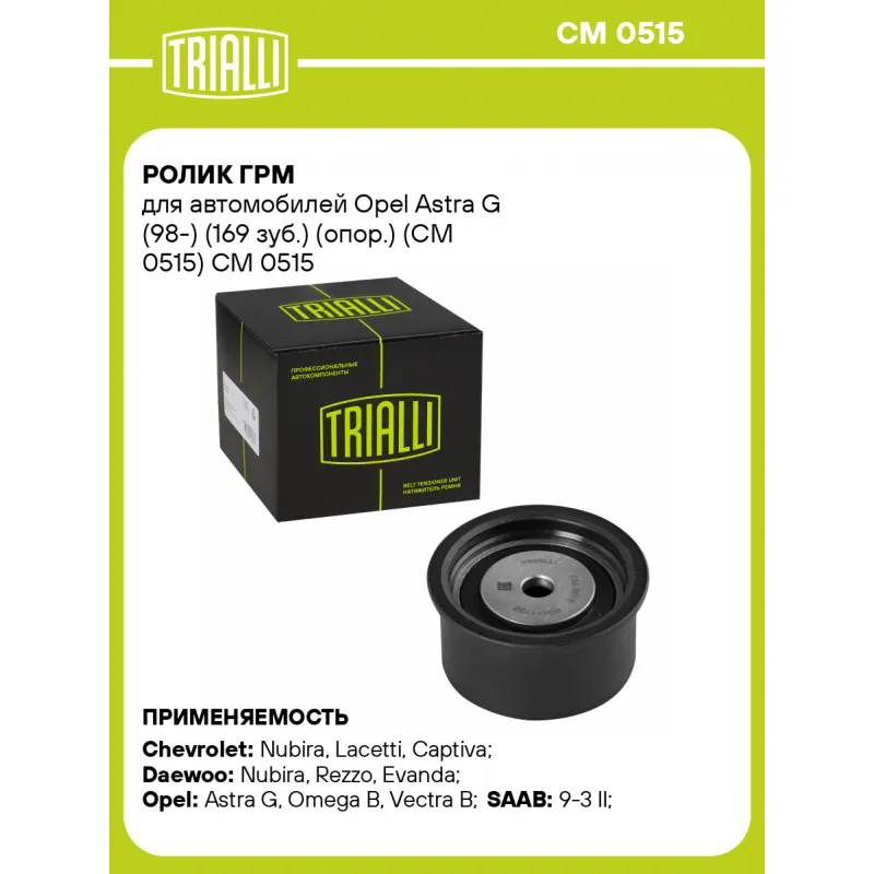 Ролик ГРМ для автомобилей Opel Astra G (98-) (169 зуб.) (опор.) (CM 0515) Характеристики: Артикул: CM 0515 OEM номера: 8091287380, 90411782, 9128738, 636415, 5636425, 09128738 Сопутствующий товар: Ролики ГРМ: CM 2130 Количество на автомобиль: 1 Материал: пластик/металл Особенности конструкции:: под ремень 169 зуб. Внешний диаметр, мм: 59 Гарантийный срок: 2 года/60 000 км. Внутренний диаметр, мм: 8 Ширина, мм: 26 Тип ролика: автоматический Товарная линейка: BLACK Сопутствующие товары:: CM 0515, CM 0562, CM 0516, CM 0517 Подходит для авто: Chevrolet Nubira (05-), Lacetti (02-), Captiva (06-) Daewoo Nubira (97-), Rezzo (00-), Evanda (02-) Opel Astra G (98-), Omega B (94-), Vectra B (95-), Vectra A (88-), Combo C (01-), Corsa C (00-), Meriva A (03-), Vectra C (02-), Astra G (98-), Vectra B (95-), Antara (06-), Astra H (04-), Zafira A (99-), Zafira B (05-) SAAB 9-3 II (04-) Для проверки применяемости отправьте VIN автомобиля через вкладку "Есть вопросы о товаре?" Комплектация: Ролик ГРМ - 1 шт Гарантия: от 1 года.