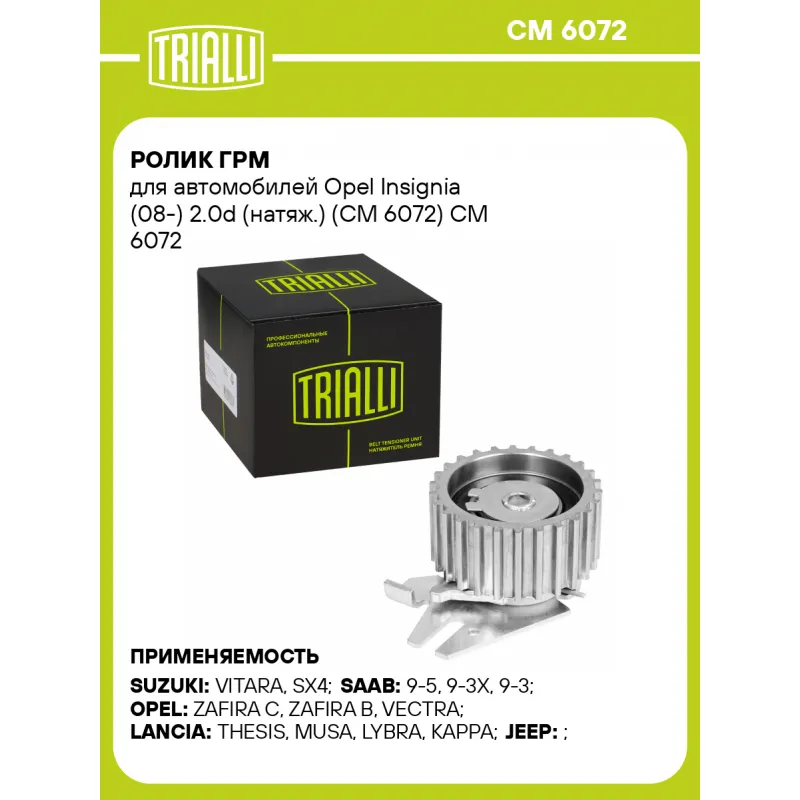 Ролик ГРМ для автомобилей Opel Insignia (08-) 2.0d (натяж.) (CM 6072) Характеристики: Артикул: CM 6072 OEM номера: 55183527, 55191315, 55192323, 55208381, 55212159, 55215666, 55238027, 60813592, 71747799, 7778565, 5636475, 93191364, 55566028, 68222043AA, 5636456, 5636745, 636931, 93178816, 93181966, 93186866, 636685, 636317, 1281079J50, 1281079J52, 1281079J80, 1281079J81 Гарантийный срок: 2 года/60 000 км. Сопутствующий товар: Ролики ГРМ: CM 6454 Количество на автомобиль: 1 Материал: пластмасса/металл (сталь) Внешний диаметр, мм: 65 Внутренний диаметр, мм: 8 Ширина, мм: 30 Товарная линейка: BLACK Комплектация: Ролик ГРМ - 1 шт Гарантия: от 1 года.
