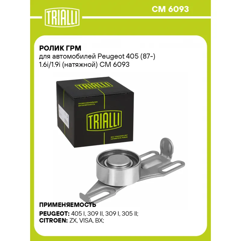 Ролик ГРМ для автомобилей Peugeot 405 (87-) 1.6i/1.9i (натяжной) Характеристики: Артикул: CM 6093 OEM номера: 082912, 91508298 Гарантийный срок: 2 года/60 000 км. Количество на автомобиль: 1 Внешний диаметр, мм: 57 Ширина, мм: 24 Товарная линейка: BLACK Комплектация: Ролик ГРМ - 1 шт Гарантия: от 1 года.... Читать полностью →
