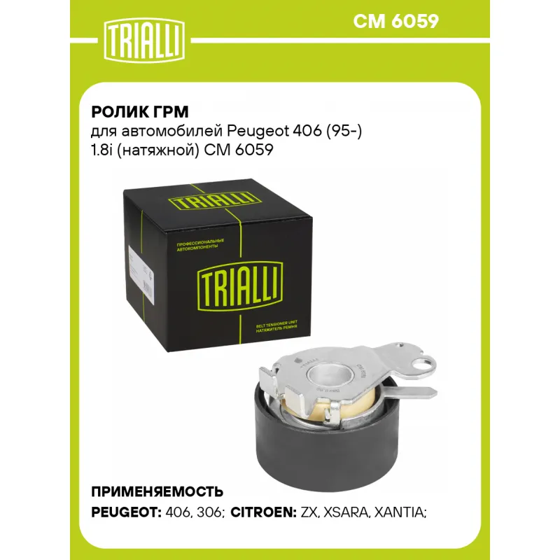 Ролик ГРМ для автомобилей Peugeot 406 (95-) 1.8i (натяжной) Характеристики: Артикул: CM 6059 OEM номера: 0829.69, 96353368, 9635336880 Гарантийный срок: 2 года/60 000 км. Сопутствующий товар: Ролики ГРМ: CM 6425 Количество на автомобиль: 1 Внешний диаметр, мм: 60 Внутренний диаметр, мм: 8,2 Ширина, мм: 29 Товарная линейка: BLACK Комплектация: Ролик ГРМ - 1 шт Гарантия: от 1 года.