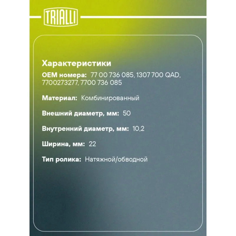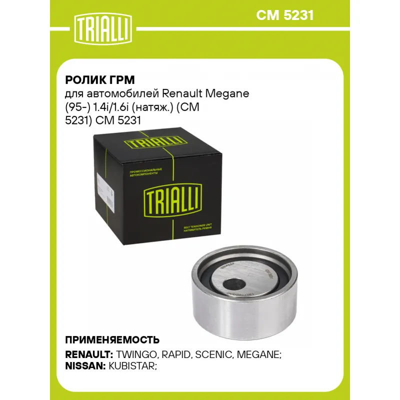 Ролик ГРМ для автомобилей Renault Megane (95-) 1.4i/1.6i (натяж.) (CM 5231) Характеристики: Артикул: CM 5231 OEM номера: 77 00 736 085, 1307 700 QAD, 7700273277, 7700 736 085 Гарантийный срок: 2 года/60 000 км. Количество на автомобиль: 1 Внешний диаметр, мм: 50 Внутренний диаметр, мм: 10,2 Ширина, мм: 22 Товарная линейка: BLACK Комплектация: Ролик ГРМ - 1 шт Гарантия: от 1 года.