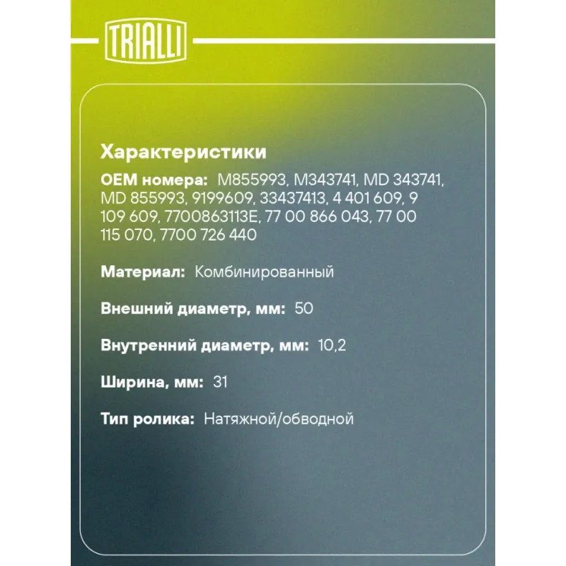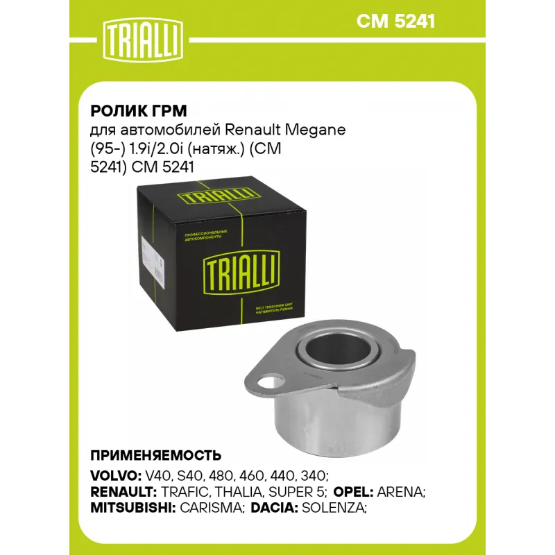 Ролик ГРМ для автомобилей Renault Megane (95-) 1.9i/2.0i (натяж.) (CM 5241) Характеристики: Артикул: CM 5241 OEM номера: M855993, M343741, MD 343741, MD 855993, 9199609, 33437413, 4 401 609, 9 109 609, 7700863113E, 77 00 866 043, 77 00 115 070, 7700 726 440, 77 00 863 113, 60 01 545 398, 1281084CT1, 4401609, 9109 609, VOLVGT001, 3883811, 334341, 30 855 993, 3 343 741, 7700866043, 77 00 863 113E, 77 00 726 440 Гарантийный срок: 2 года/60 000 км. Сопутствующий товар: Ролики ГРМ: CM 6437 Количество на автомобиль: 1 Внешний диаметр, мм: 50 Внутренний диаметр, мм: 10,2 Ширина, мм: 31 Товарная линейка: BLACK Комплектация: Ролик ГРМ - 1 шт Гарантия: от 1 года.