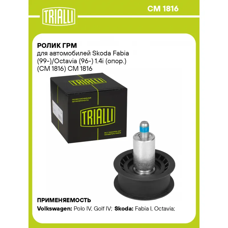 Ролик ГРМ для автомобилей Skoda Fabia (99-)/Octavia (96-) 1.4i (опор.) (CM 1816) Характеристики: Артикул: CM 1816 OEM номера: 036.109.244D, 036 109 244 J, 036109244C, 036109244D, 036.109.244J, 03.6109.244C Сопутствующий товар: Ролики ГРМ: CM 1813, CM 6052 Количество на автомобиль: 1 Материал: металл Внешний диаметр, мм: 56 Гарантийный срок: 2 года/60 000 км. Внутренний диаметр, мм: 10 Ширина, мм: 25.5 Тип ролика: механический Товарная линейка: BLACK Подходит для авто: Volkswagen Polo IV (01-), Polo IV (01-), Golf IV (97-) Skoda Fabia I (99-), Octavia (96-) Для проверки применяемости отправьте VIN автомобиля через вкладку "Есть вопросы о товаре?" Комплектация: Ролик ГРМ - 1 шт Гарантия: от 1 года.