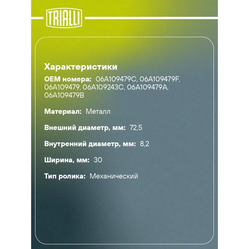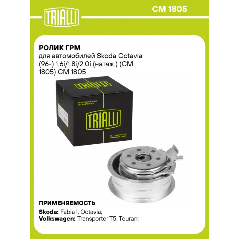 Ролик ГРМ для автомобилей Skoda Octavia (96-) 1.6i/1.8i/2.0i (натяж.) (CM 1805) Характеристики: Артикул: CM 1805 OEM номера: 06A109479C, 06A109479F, 06A109479, 06A109243C, 06A109479A, 06A109479B Количество на автомобиль: 1 Материал: металл Внешний диаметр, мм: 72.5 Гарантийный срок: 2 года/60 000 км. Внутренний диаметр, мм: 8,2 Ширина, мм: 30 Тип ролика: механический Товарная линейка: BLACK Подходит для авто: Skoda Fabia I (99-), Octavia (96-) Volkswagen Transporter T5 (03-), Touran (03-), Golf IV (97-), Jetta (05-) Для проверки применяемости отправьте VIN автомобиля через вкладку "Есть вопросы о товаре?" Комплектация: Ролик ГРМ - 1 шт Гарантия: от 1 года.