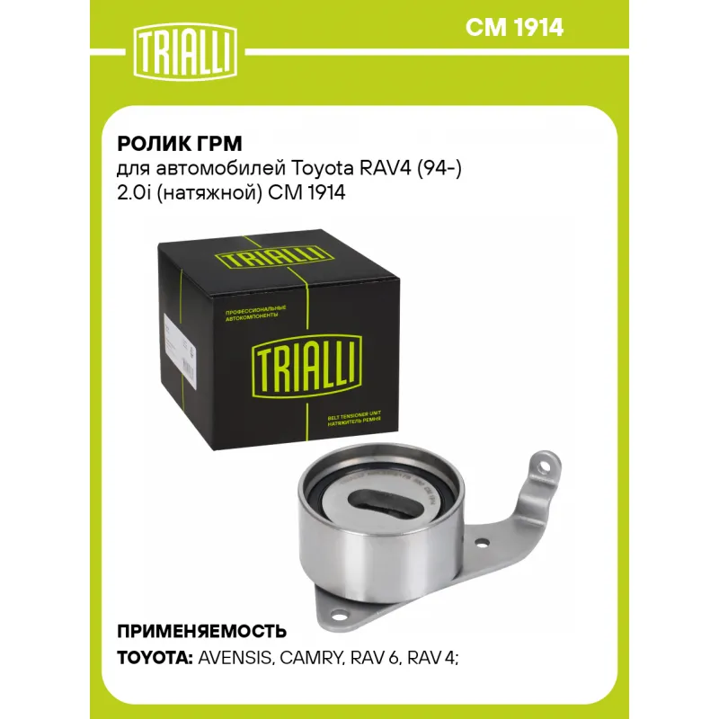 Ролик ГРМ для автомобилей Toyota RAV4 (94-) 2.0i (натяжной) Характеристики: Артикул: CM 1914 OEM номера: 1350374011, 13505102F0, 1350570011, 1350574010, 1350574011, 1350574020, 1350574021 Ширина, мм: 29 Внешний диаметр, мм: 57,5 Внутренний диаметр, мм: 11,5 Гарантийный срок: 2 года/60 000 км. Сопутствующий товар: Ролики ГРМ: CM ... Читать полностью →
