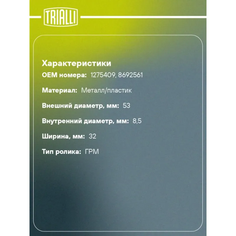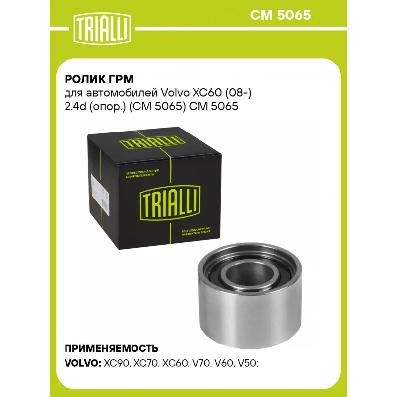 Ролик ГРМ для автомобилей Volvo XC60 (08-) 2.4d (опор.) (CM 5065) Характеристики: Артикул: CM 5065 OEM номера: 1275409, 8692561 Количество на автомобиль: 1 Материал: металл/пластик Внешний диаметр, мм: 53 Гарантийный срок: 2 года/60 000 км. Внутренний диаметр, мм: 8.5 Ширина, мм: 32 Тип ролика: ГРМ Товарная линейка: BLACK Комп... Читать полностью →