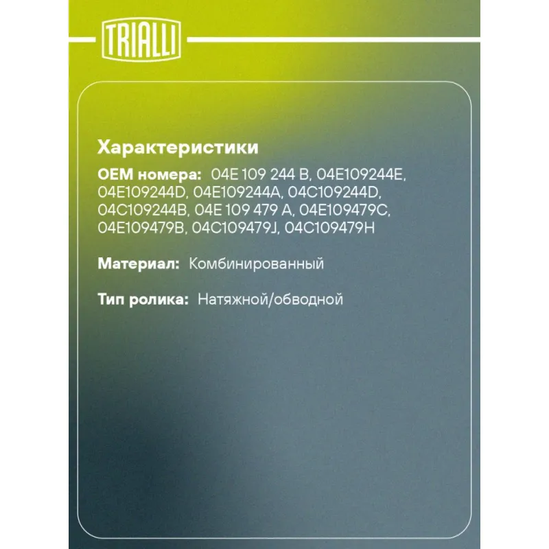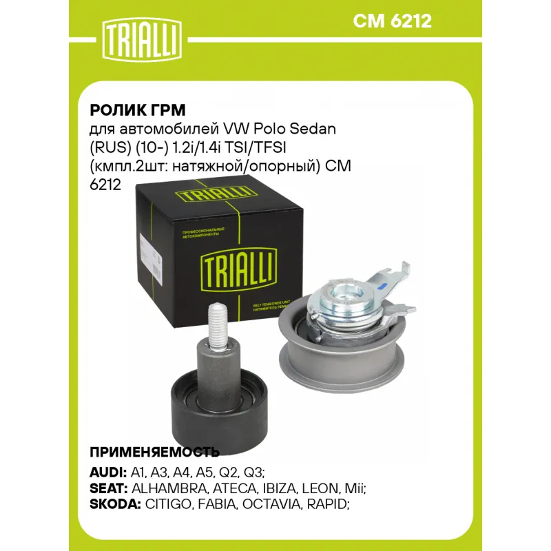 Ролик ГРМ для автомобилей VW Polo Sedan (RUS) (10-) 1.2i/1.4i TSI/TFSI (кмпл.2шт: натяжной/опорный) Характеристики: Артикул: CM 6212 OEM номера: 04E 109 244 B, 04E109244E, 04E109244D, 04E109244A, 04C109244D, 04C109244B, 04E 109 479 A, 04E109479C, 04E109479B, 04C109479J, 04C109479H, 04C109479G, 04E 109 479 AA, 04E 109 479 T, 04C 109 479 K Гарантийный срок: 2 года/60 000 км. Количество на автомобиль: 1 Материал: Комбинированный Товарная линейка: BLACK Комплектация: Ролики ГРМ - 2 шт Гарантия: от 1 года.