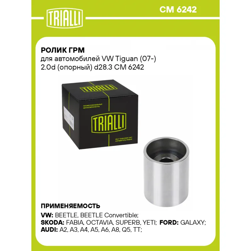Ролик ГРМ для автомобилей VW Tiguan (07-) 2.0d (опорный) d28.3 Характеристики: Артикул: CM 6242 OEM номера: 045 109 244 A, 03L 109 244 C Ширина, мм: 34 Внешний диаметр, мм: 28.3 Внутренний диаметр, мм: 8.2 Гарантийный срок: 2 года/60 000 км. Сопутствующий товар: Ролики ГРМ: CM 6132, CM 6054 Количество на автомобиль: 1 Материал: ... Читать полностью →