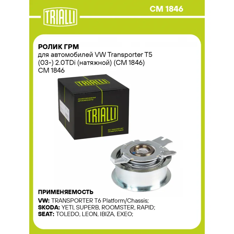 Ролик ГРМ для автомобилей VW Transporter T5 (03-) 2.0TDi (натяжной) (CM 1846) Характеристики: Артикул: CM 1846 OEM номера: 03L109243D, 03L.109.243D, 03L.109.243B, 03L109243F, 03L109243C, 03L109243B, 03L109243BF Гарантийный срок: 2 года/60 000 км. Количество на автомобиль: 1 Внешний диаметр, мм: 78,5 Внутренний диаметр, мм: 8,2 Ширина, мм: 29,5 Тип ролика: натяжной Товарная линейка: BLACK Комплектация: Ролик ГРМ - 1 шт Гарантия: от 1 года.