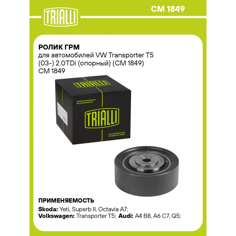 Ролик ГРМ для автомобилей VW Transporter T5 (03-) 2.0TDi (опорный) (CM 1849) Характеристики: Артикул: CM 1849 OEM номера: 03L 109 244 B, 3L109244E, 03L109244J, 03L109244, 03L109244E, 3L109244J, 3L109244 Гарантийный срок: 2 года/60 000 км. Количество на автомобиль: 1 Внешний диаметр, мм: 80 Внутренний диаметр, мм: 10 Ширина, мм: 29 Тип ролика: опорный Товарная линейка: BLACK Подходит для авто: Skoda Yeti (09-), Superb II (08-), Octavia A7 (13-) Volkswagen Transporter T5 (03-), Transporter T6 (15-), Caddy (04-), Multivan (03-), Tiguan (08-), Sharan (10-), Golf VI (08-), Caddy (04-), Passat B7 (10-) Audi A4 B8 (07-), A6 C7 (11-), Q5 (08-) Для проверки применяемости отправьте VIN автомобиля через вкладку "Есть вопросы о товаре?" Комплектация: Ролик ГРМ - 1 шт Гарантия: от 1 года.