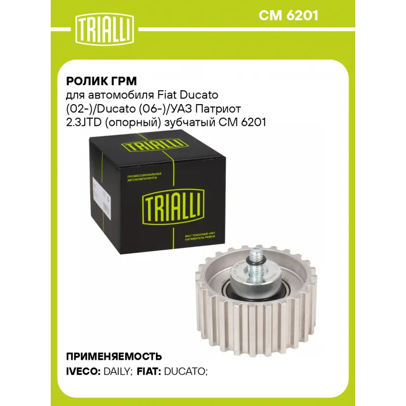 Ролик ГРМ для автомобиля Fiat Ducato (02-)/Ducato (06-)/УАЗ Патриот 2.3JTD (опорный) зубчатый Характеристики: Артикул: CM 6201 OEM номера: 500388688, 500390458 Внутренний диаметр, мм: 8 Гарантийный срок: 2 года/60 000 км. Сопутствующий товар: Ролики ГРМ: CM 6100 Количество на автомобиль: 1 Материал: Комбинированный Внешний диаметр, мм: 71 Ширина, мм: 34 Товарная линейка: BLACK Комплектация: Ролик ГРМ - 1 шт Гарантия: от 1 года.