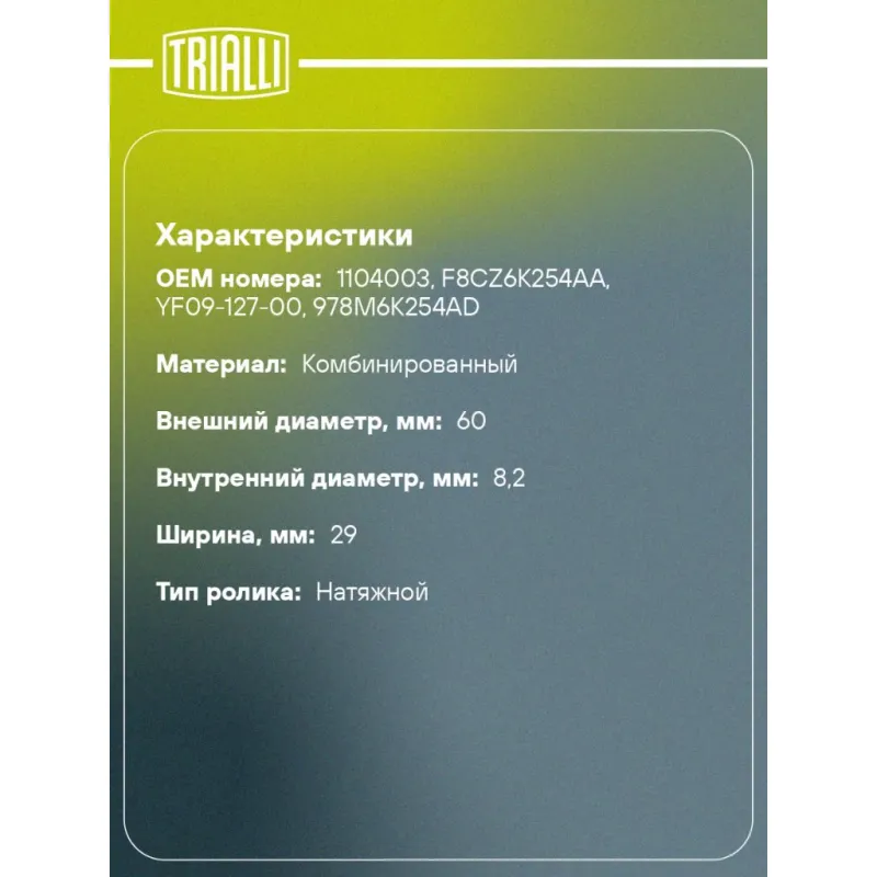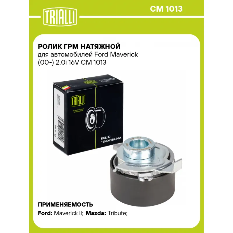 Ролик ГРМ натяжной для автомобилей Ford Maverick (00-) 2.0i 16V Характеристики: Артикул: CM 1013 OEM номера: 1104003, F8CZ6K254AA, YF09-127-00, 978M6K254AD Гарантийный срок: 2 года/60 000 км. Количество на автомобиль: 1 Внешний диаметр, мм: 60 Внутренний диаметр, мм: 8,2 Ширина, мм: 29 Тип ролика: натяжной Товарная линейка: BLACK Подходит для авто: Ford Maverick II (00-) Mazda Tribute (00-) Для проверки применяемости отправьте VIN автомобиля через вкладку "Есть вопросы о товаре?" Комплектация: Ролик ГРМ - 1 шт Гарантия: от 1 года.