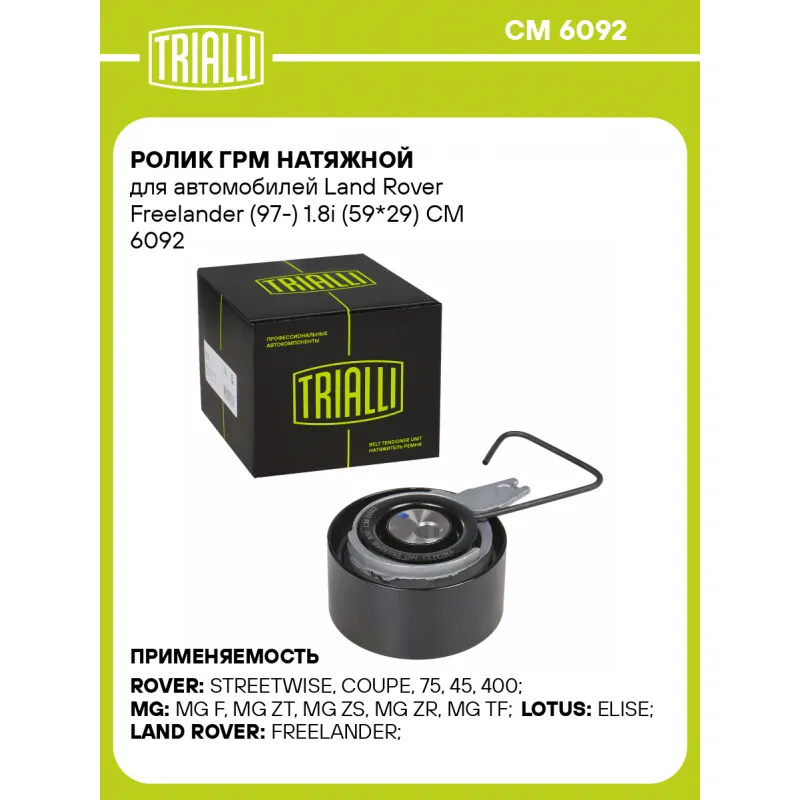 Ролик ГРМ натяжной для автомобилей Land Rover Freelander (97-) 1.8i (59*29) Характеристики: Артикул: CM 6092 OEM номера: LHP100900L, LHP100900, 10007941 Гарантийный срок: 2 года/60 000 км. Количество на автомобиль: 1 Материал: пластмасса/металл (сталь) Внешний диаметр, мм: 59 Внутренний диаметр, мм: 8,2 Ширина, мм: 29 Товарная линейка: BLACK Комплектация: Ролик ГРМ - 1 шт Гарантия: от 1 года.