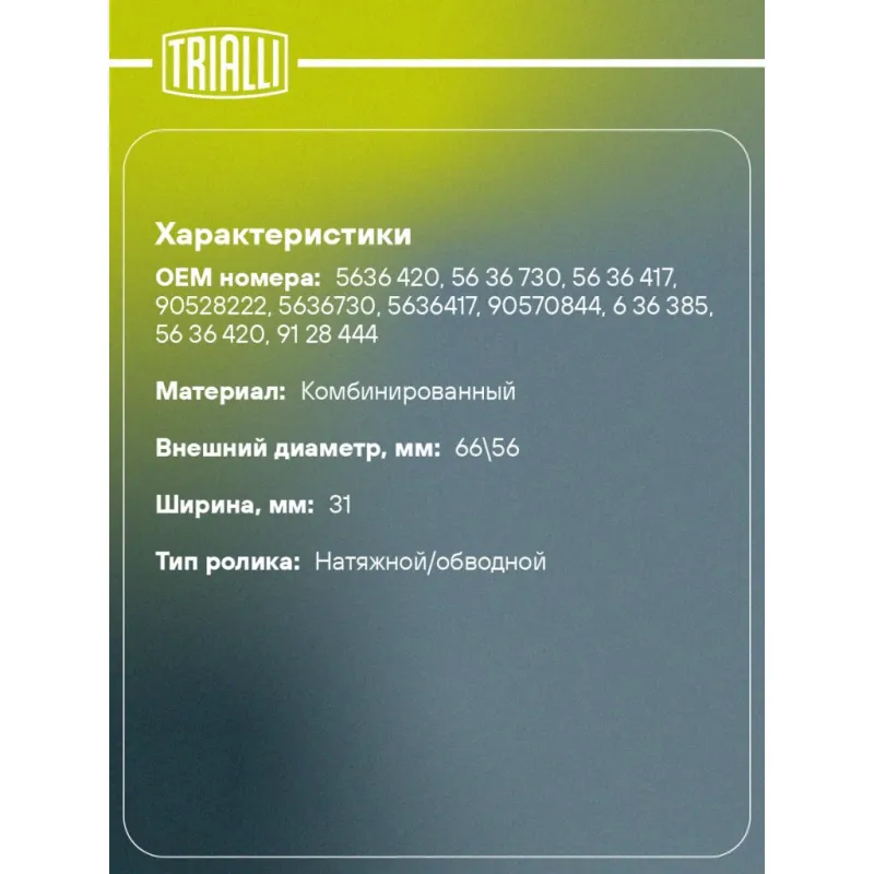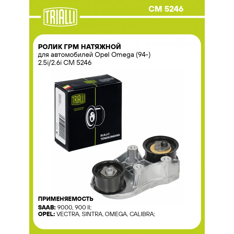 Ролик ГРМ натяжной для автомобилей Opel Omega (94-) 2.5i/2.6i Характеристики: Артикул: CM 5246 OEM номера: 5636 420, 56 36 730, 56 36 417, 90528222, 5636730, 5636417, 90570844, 6 36 385, 56 36 420, 91 28 444 Гарантийный срок: 2 года/60 000 км. Сопутствующий товар: Ролики ГРМ: CM 5227 Количество на автомобиль: 1 Внешний диаметр, мм: 66\56 Ширина, мм: 31 Товарная линейка: BLACK Комплектация: Ролик ГРМ - 1 шт Гарантия: от 1 года.