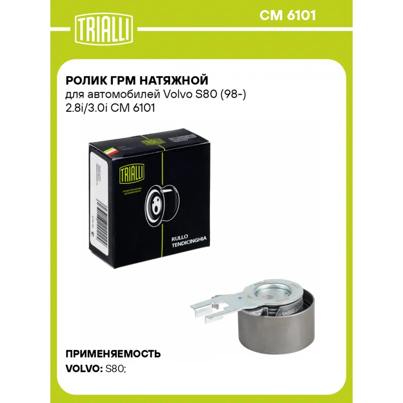Ролик ГРМ натяжной для автомобилей Volvo S80 (98-) 2.8i/3.0i Характеристики: Артикул: CM 6101 OEM номера: 8658 225, 9 440 904 Гарантийный срок: 2 года/60 000 км. Количество на автомобиль: 1 Материал: Металл Внешний диаметр, мм: 59 Внутренний диаметр, мм: 8,2 Ширина, мм: 32 Товарная линейка: BLACK Комплектация: Ролик ГРМ - 1 ш... Читать полностью →