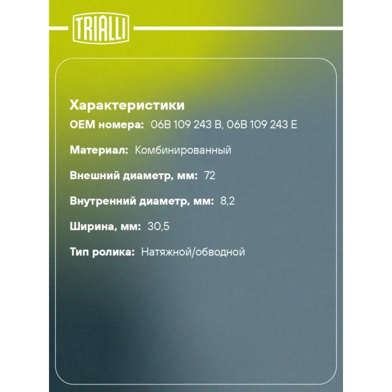 Ролик ГРМ натяжной для автомобилей VW Passat B5 (96-) 1.8T/2.0i (d82) Характеристики: Артикул: CM 6144 OEM номера: 06B 109 243 B, 06B 109 243 E Гарантийный срок: 2 года/60 000 км. Количество на автомобиль: 1 Внешний диаметр, мм: 72 Внутренний диаметр, мм: 8,2 Ширина, мм: 30,5 Товарная линейка: BLACK Комплектация: Ролик ГРМ - ... Читать полностью →