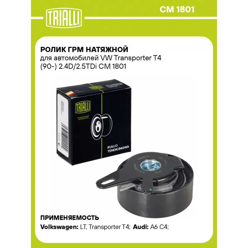 Ролик ГРМ натяжной для автомобилей VW Transporter T4 (90-) 2.4D/2.5TDi Характеристики: Артикул: CM 1801 OEM номера: 074109243F, 074109243G, 074109243J, 074109243R Материал: металл/пластик Внутренний диаметр, мм: 8,2 Гарантийный срок: 2 года/60 000 км. Сопутствующий товар: Ролики ГРМ: CM 7041 Количество на автомобиль: 1 Особенности конструкции:: автоматический Внешний диаметр, мм: 73 Ширина, мм: 27 Тип ролика: натяжной Товарная линейка: BLACK Подходит для авто: Volkswagen LT (96-), Transporter T4 (90-) Audi A6 C4 (94-) Для проверки применяемости отправьте VIN автомобиля через вкладку "Есть вопросы о товаре?" Комплектация: Ролик ГРМ - 1 шт Гарантия: от 1 года.