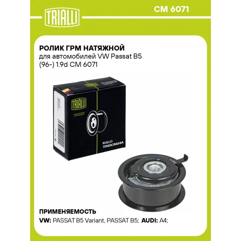 Ролик ГРМ натяжной для автомобилей VW Passat B5 (96-) 1.9d Характеристики: Артикул: CM 6071 OEM номера: 028109243K, 028109243J, 028109243H Гарантийный срок: 2 года/60 000 км. Количество на автомобиль: 1 Внешний диаметр, мм: 67 Внутренний диаметр, мм: 8,2 Ширина, мм: 30 Товарная линейка: BLACK Комплектация: Ролик ГРМ - 1 шт Гарантия: от 1 года.
