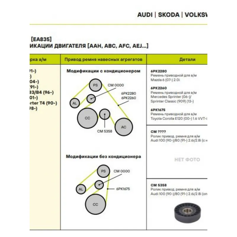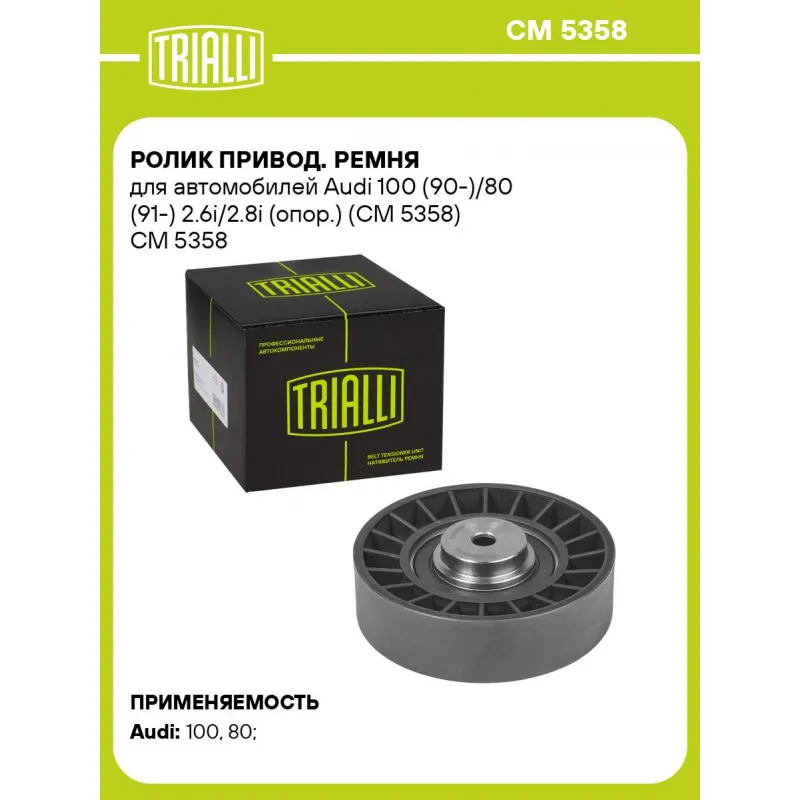 Ролик привод. ремня для автомобилей Audi 100 (90-)/80 (91-) 2.6i/2.8i (опор.) (CM 5358) Характеристики: Артикул: CM 5358 OEM номера: 078903341J, 078 903 341J, 078 903 341 J, 078 903 341 B Сопутствующие товары:: 6PK2280, 6PK2260, 6PK1675 Количество на автомобиль: 1 Внешний диаметр, мм: 91 Внутренний диаметр, мм: 0 Ширина, мм: 25 Гарантийный срок: 2 года/60 000 км. Сопутствующий товар: Ремни: 6PK2280, 6PK2260, 6PK1675 Товарная линейка: BLACK Подходит для авто: Audi 100 (90-), 80 (91-) Для проверки применяемости отправьте VIN автомобиля через вкладку "Есть вопросы о товаре?" Комплектация: Ролик приводного ремня - 1 шт Гарантия: от 1 года.