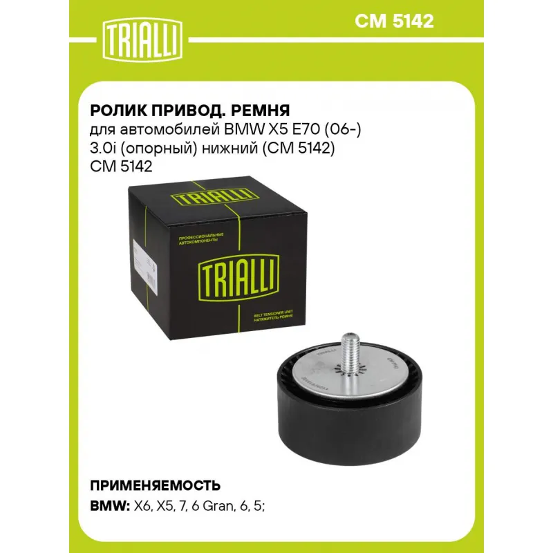 Ролик привод. ремня для автомобилей BMW X5 E70 (06-) 3.0i (опорный) нижний (CM 5142) Характеристики: Артикул: CM 5142 OEM номера: 11287589886, 11 28 7 615 130 Сопутствующие товары:: 8PK1390, 8PK1478, CM 5144, CM 5147 Сопутствующий товар: Ролики приводного ремня: CM 5144, CM 5147 Количество на автомобиль: 1 Внешний диаметр, мм: 75 Ширина, мм: 32 Гарантийный срок: 2 года/60 000 км. Сопутствующий товар: Ремни: 8PK1390, 8PK1478 Товарная линейка: BLACK Комплектация: Ролик привод. ремня - 1 шт Гарантия: от 1 года.