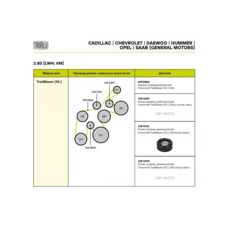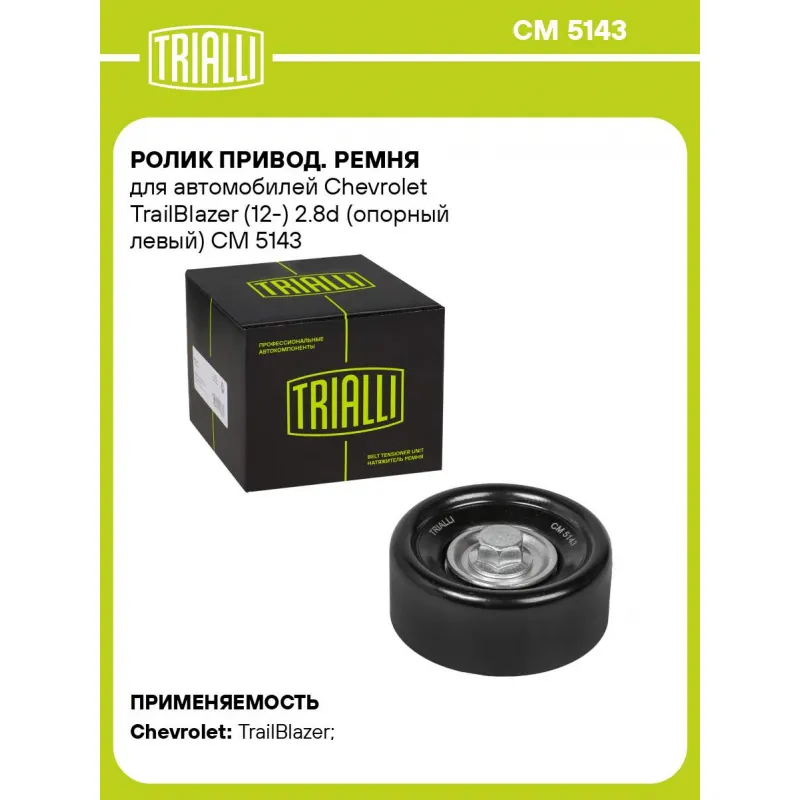 Ролик привод. ремня для автомобилей Chevrolet TrailBlazer (12-) 2.8d (опорный левый) Характеристики: Артикул: CM 5143 OEM номера: 94722019 Сопутствующие товары:: 6PK2824, CM 5869, CM 5870 Ширина, мм: 31 Сопутствующий товар: Ролики приводного ремня: CM 5869, CM 5870 Количество на автомобиль: 1 Внешний диаметр, мм: 76 Гарантийный срок: 2 года/60 000 км. Материал: Комбинированный Сопутствующий товар: Ремни: 6PK2824 Товарная линейка: BLACK Подходит для авто: Chevrolet TrailBlazer (12-) Для проверки применяемости отправьте VIN автомобиля через вкладку "Есть вопросы о товаре?" Комплектация: Ролик привод. ремня - 1 шт Гарантия: от 1 года.