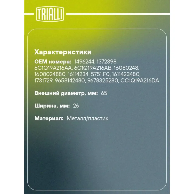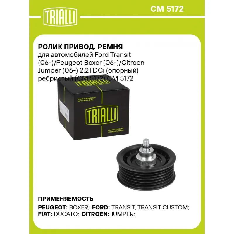 Ролик привод. ремня для автомобилей Ford Transit (06-)/Peugeot Boxer (06-)/Citroen Jumper (06-) 2.2TDCi (опорный) ребристый (CM 5172) Характеристики: Артикул: CM 5172 OEM номера: 1496244, 1372398, 6C1Q19A216AA, 6C1Q19A216AB, 16080248, 1608024880, 16114234, 5751.F0, 1611423480, 1731729, 9658142480, 9678325280, CC1Q19A216DA Сопутствующие товары:: 6PK1685, 6PK873E, 4PK922E, 7PK3170, 7PK3143, 7PK3136, 7PK3120, 7PK3103, CM 5630, CM 1011 Сопутствующий товар: Ролики приводного ремня: CM 5630, CM 1011 Количество на автомобиль: 1 Внешний диаметр, мм: 65 Внутренний диаметр, мм: 8 Ширина, мм: 26 Гарантийный срок: 2 года/60 000 км. Материал: металл/пластик Сопутствующий товар: Ремни: 6PK1685, 6PK873E, 4PK922E, 7PK3170, 7PK3143, 7PK3136, 7PK3120, 7PK3103 Товарная линейка: BLACK Комплектация: Ролик приводного ремня - 1 шт Гарантия: от 1 года.