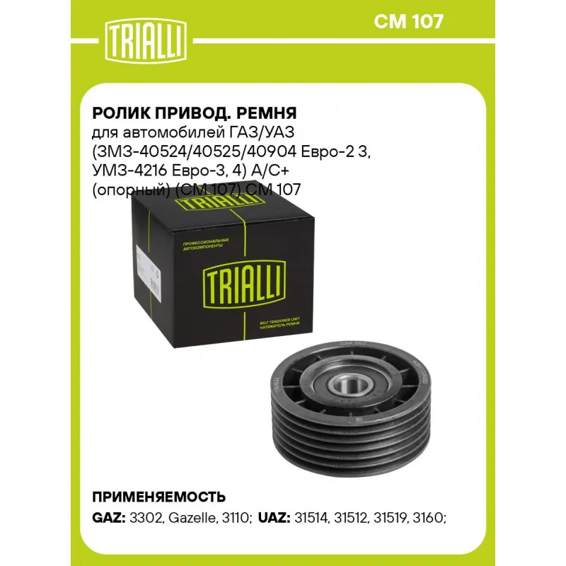 Ролик привод. ремня для автомобилей ГАЗ/УАЗ (ЗМЗ-40524/40525/40904 Евро-2 3, УМЗ-4216 Евро-3, 4) А/С+ (опорный) (CM 107) Характеристики: Артикул: CM 107 OEM номера: 4091-1308080, 4091.1308080-02, 4091.1308080-00, 4091.1308080-01, 4091.1308080-08 Сопутствующий товар: Ролики приводного ремня: CM 0301, CM 103, CM 142 Количество на автомобиль: 1 Сопутствующие товары:: CM 0301, CM 103, CM 109 Внешний диаметр, мм: 60 Особенности конструкции:: ручейковый, под кондиционер Ширина, мм: 22 Гарантийный срок: 2 года/60 000 км. Материал: Комбинированный Сопутствующий товар: Ремни: 6PK1370, 6PK1805, 6PK1767, 6PK1750, AVX10X750, AVX13X750, AVX13X775 Товарная линейка: BLACK Подходит для авто: ГАЗ 3302, Gazelle, 3110, 3110 УАЗ 31514, 31512, 31519, 3160 (97-) Для проверки применяемости отправьте VIN автомобиля через вкладку "Есть вопросы о товаре?" Комплектация: Ролик приводного ремня - 1 шт Гарантия: от 1 года.