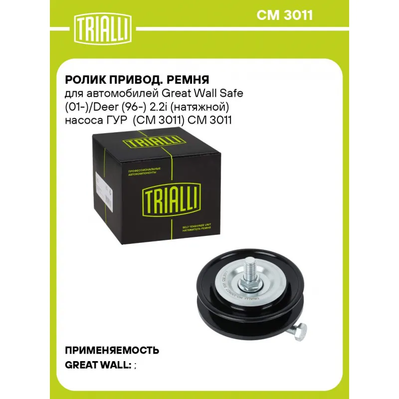 Ролик привод. ремня для автомобилей Great Wall Safe (01-)/Deer (96-) 2.2i (натяжной) насоса ГУР (CM 3011) Характеристики: Артикул: CM 3011 OEM номера: 8103040D01 Материал: металл/пластик Сопутствующий товар: Ролики приводного ремня: CM 5671 Количество на автомобиль: 1 Внешний диаметр, мм: 83,5 Ширина, мм: 21,5 Гарантийный срок: 2 года/60 000 км. Сопутствующий товар: Ремни: 4PK830, AVX13X910, AVX13X1125, AVX13X1150 Товарная линейка: BLACK Комплектация: Ролик приводного ремня - 1 шт Гарантия: от 1 года.