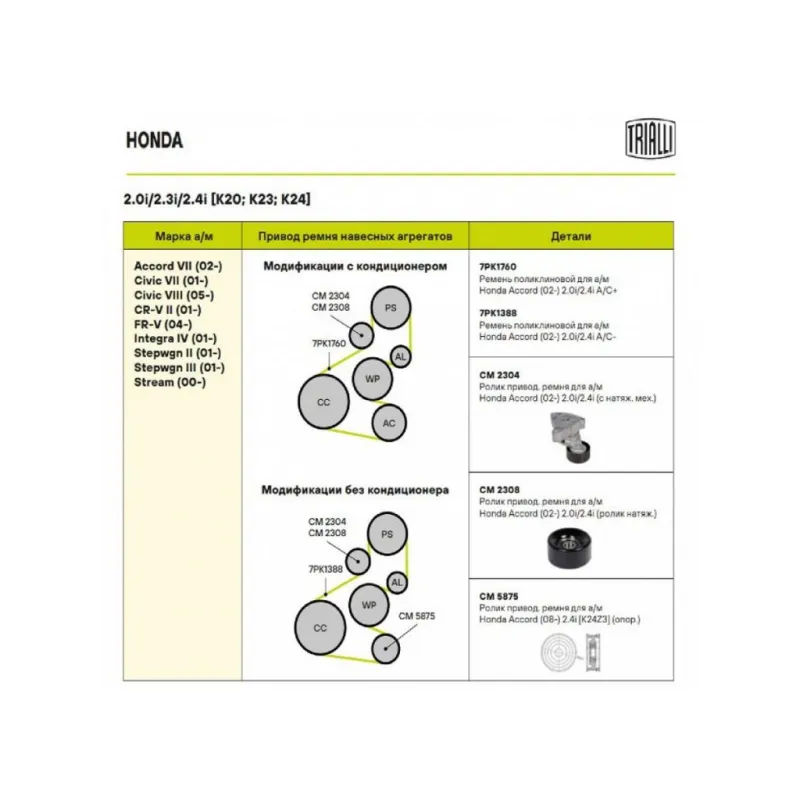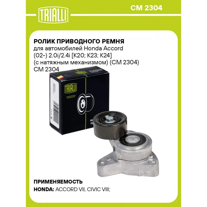 Ролик приводного ремня для автомобилей Honda Accord (02-) 2.0i/2.4i [K20; K23; K24] (с натяжным механизмом) (CM 2304) Характеристики: Артикул: CM 2304 OEM номера: 31170PNA003, 31170PNA013, 31170PNA023, 31170RAAA01, 31170RAAA02, 311709NA023 Сопутствующий товар: Ролики приводного ремня: CM 2308, CM 5875 Количество на автомобиль: 1 Внешний диаметр, мм: 76 Особенности конструкции:: механизм натяжения приводного ремня Ширина, мм: 37 Гарантийный срок: 2 года/60 000 км. Материал: Комбинированный Сопутствующий товар: Ремни: 7PK1760, 7PK1388 Товарная линейка: BLACK Комплектация: Ролик приводного ремня с натяжным механизмом - 1 шт Гарантия: от 1 года.