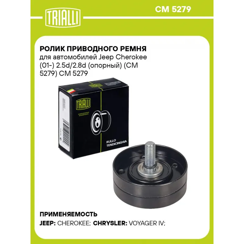 Ролик приводного ремня для автомобилей Jeep Cherokee (01-) 2.5d/2.8d (опорный) (CM 5279) Характеристики: Артикул: CM 5279 OEM номера: 04861633AA, 4861633AA, 5066938AA Количество на автомобиль: 1 Внешний диаметр, мм: 70 Внутренний диаметр, мм: 10 Ширина, мм: 26 Гарантийный срок: 2 года/60 000 км. Материал: Металл Товарная линейка: BLACK Комплектация: Ролик приводного ремня - 1 шт Гарантия: от 1 года.