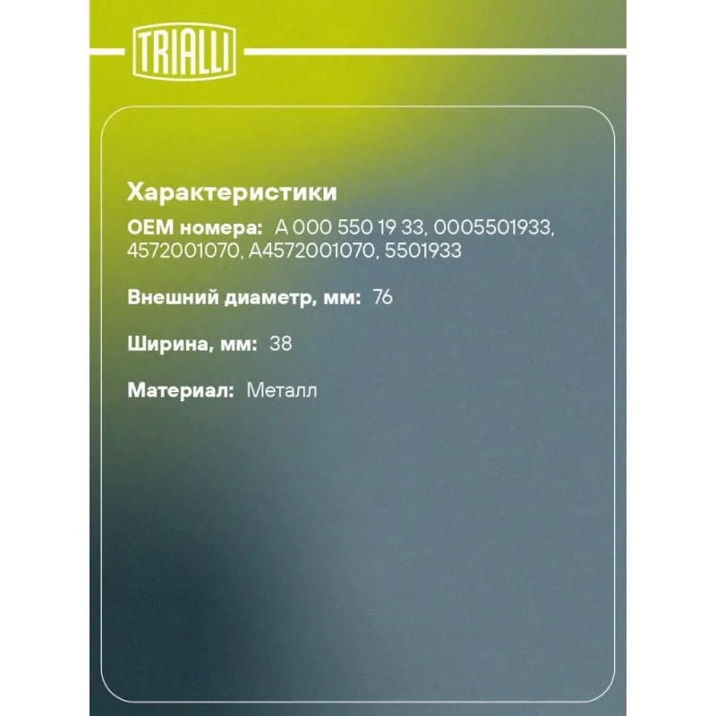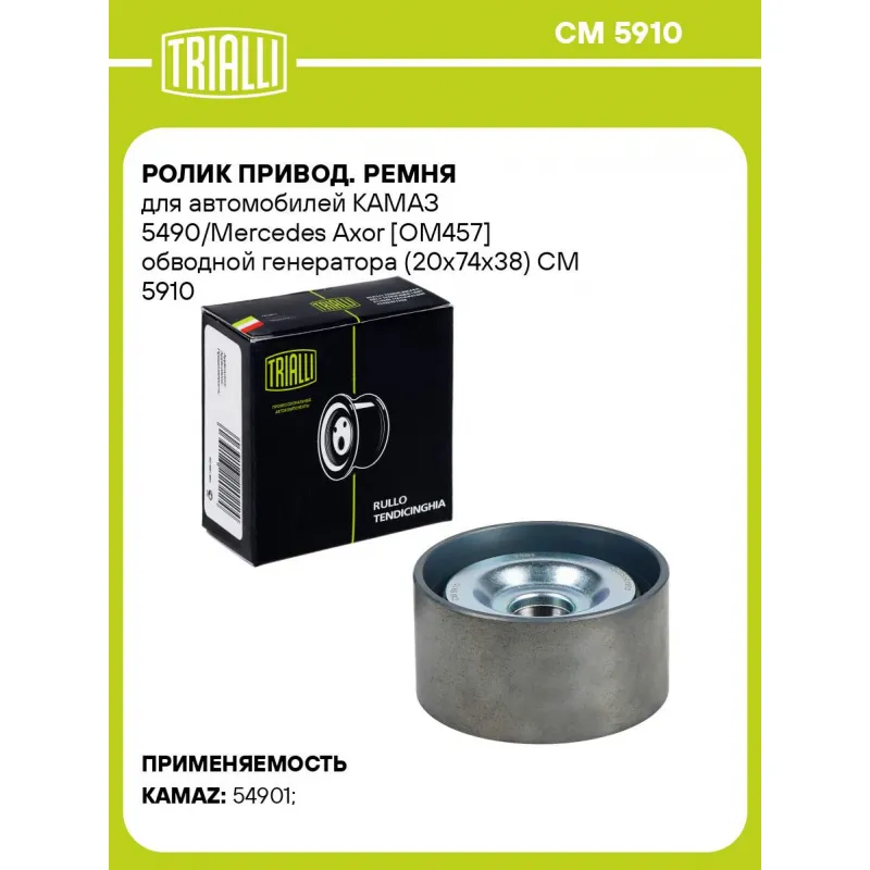 Ролик привод. ремня для автомобилей КАМАЗ 5490/Mercedes Axor [ОМ457] обводной генератора (20x74x38) Характеристики: Артикул: CM 5910 OEM номера: A 000 550 19 33, 0005501933, 4572001070, A4572001070, 5501933 Количество на автомобиль: 1 Внешний диаметр, мм: 76 Внутренний диаметр, мм: 20 Ширина, мм: 38 Гарантийный срок: 2 года/60 000 км. Материал: Металл Товарная линейка: BLACK Подходит для авто: КамаАЗ 54901 Для проверки применяемости отправьте VIN автомобиля через вкладку "Есть вопросы о товаре?" Комплектация: Ролик приводного ремня - 1 шт Гарантия: от 1 года.