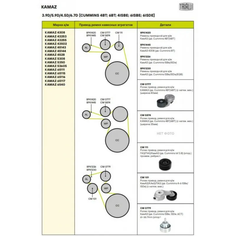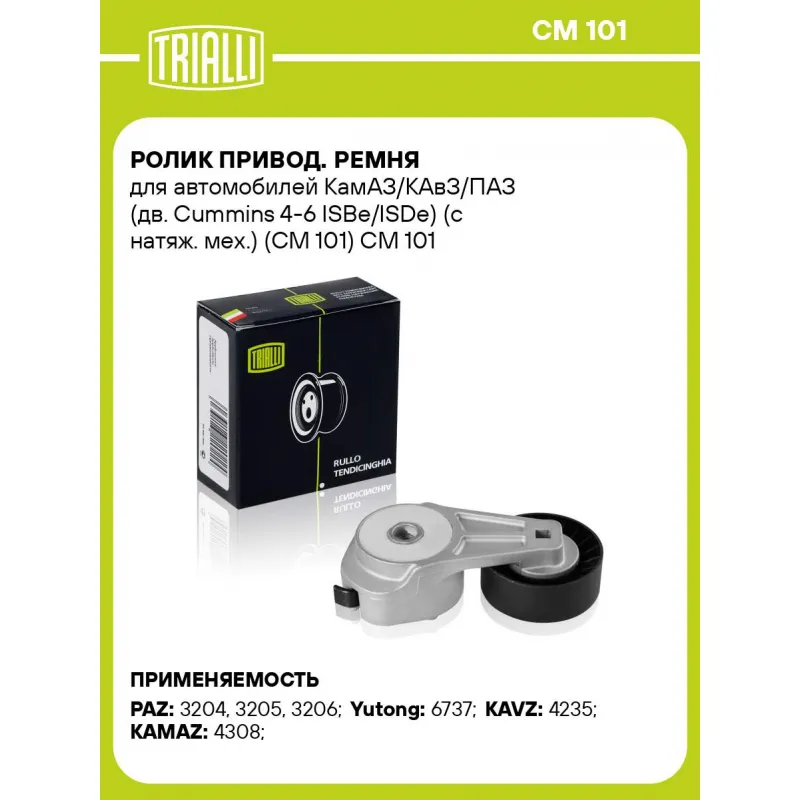 Ролик привод. ремня для автомобилей КамАЗ/КАвЗ/ПАЗ (дв. Cummins 4-6 ISBe/ISDe) (с натяж. мех.) (CM 101) Характеристики: Артикул: CM 101 OEM номера: 4987964, 4936440, 1399691, 1406486, 1702525, 504065874, 4891116, 4898548 Сопутствующий товар: Ролики приводного ремня: CM 105, CM 106 CM 110 CM 111 Количество на автомобиль: 1 Сопутствующие товары:: CM 105, CM 106, CM 110, CM 111 Внешний диаметр, мм: 85 Особенности конструкции:: дв. Cummins 4-6 ISBe/ISDe Внутренний диаметр, мм: 10 Ширина, мм: 32 Гарантийный срок: 2 года/60 000 км. Материал: Комбинированный Товарная линейка: BLACK Подходит для авто: ПАЗ 3204, 3205, 3206 Yutong 6737 KAVZ 4235 (08-) КамаАЗ 4308 Для проверки применяемости отправьте VIN автомобиля через вкладку "Есть вопросы о товаре?" Комплектация: Ролик привод. с натяж. мех. - 1 шт Гарантия: от 1 года.