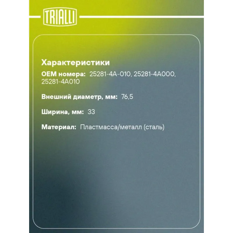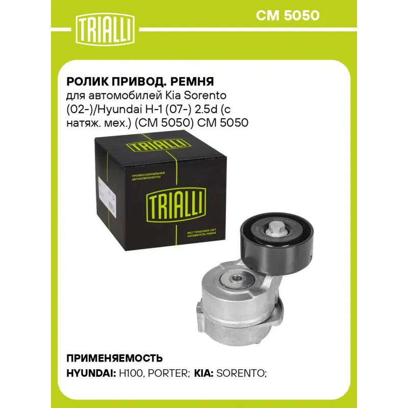 Ролик привод. ремня для автомобилей Kia Sorento (02-)/Hyundai H-1 (07-) 2.5d (с натяж. мех.) (CM 5050) Характеристики: Артикул: CM 5050 OEM номера: 25281-4A-010, 25281-4A000, 25281-4A010 Сопутствующий товар: Ролики приводного ремня: CM 0812 Количество на автомобиль: 1 Внешний диаметр, мм: 76,5 Внутренний диаметр, мм: 10,2 Ширина, мм: 33 Гарантийный срок: 2 года/60 000 км. Материал: пластмасса/металл (сталь) Сопутствующий товар: Ремни: 7PK2283, 7PK2271, 7PK1730 Товарная линейка: BLACK Комплектация: Ролик привод. ремня с натяж. мех. - 1 шт Гарантия: от 1 года.