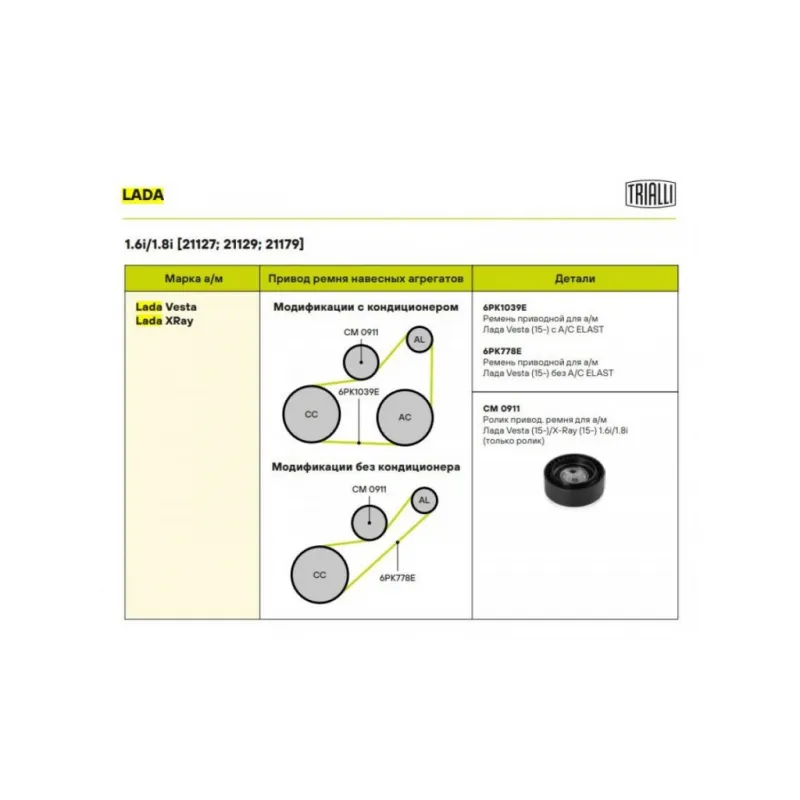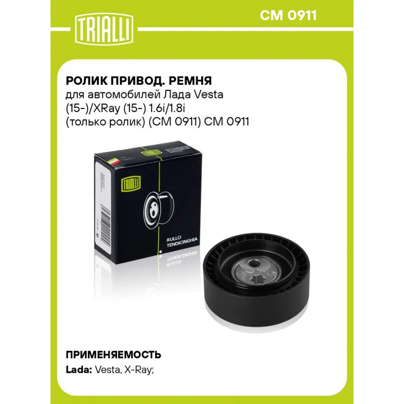 Ролик привод. ремня для автомобилей Лада Vesta (15-)/XRay (15-) 1.6i/1.8i (только ролик) (CM 0911) Характеристики: Артикул: CM 0911 OEM номера: 8450006996, 21801-0410560, 218010410560 Количество на автомобиль: 1 Сопутствующие товары:: ремень 6PK Внешний диаметр, мм: 75 Особенности конструкции:: механический Внутренний диаметр, мм: 8,4 Ширина, мм: 26 Гарантийный срок: 2 года/60 000 км. Материал: Комбинированный Товарная линейка: BLACK Подходит для авто: ВАЗ Vesta (15-), Vesta (15-), X-Ray (15-) Для проверки применяемости отправьте VIN автомобиля через вкладку "Есть вопросы о товаре?" Комплектация: Ролик приводного ремня - 1 шт Гарантия: от 1 года.