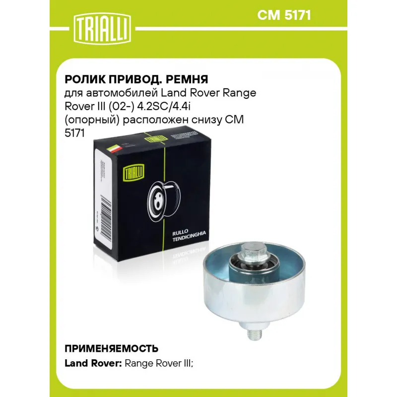 Ролик привод. ремня для автомобилей Land Rover Range Rover III (02-) 4.2SC/4.4i (опорный) расположен снизу Характеристики: Артикул: CM 5171 OEM номера: PQR 500130, PQR500350, PQR500010, PQR500230, C2C37064 Количество на автомобиль: 1 Внешний диаметр, мм: 83,5 Внутренний диаметр, мм: 17 Ширина, мм: 31 Гарантийный срок: 2 года/60 000 км. Товарная линейка: BLACK Подходит для авто: Land Rover Range Rover III (02-), Range Rover Sport I (05-) Для проверки применяемости отправьте VIN автомобиля через вкладку "Есть вопросы о товаре?" Комплектация: Ролик привод. ремня - 1 шт Гарантия: от 1 года.