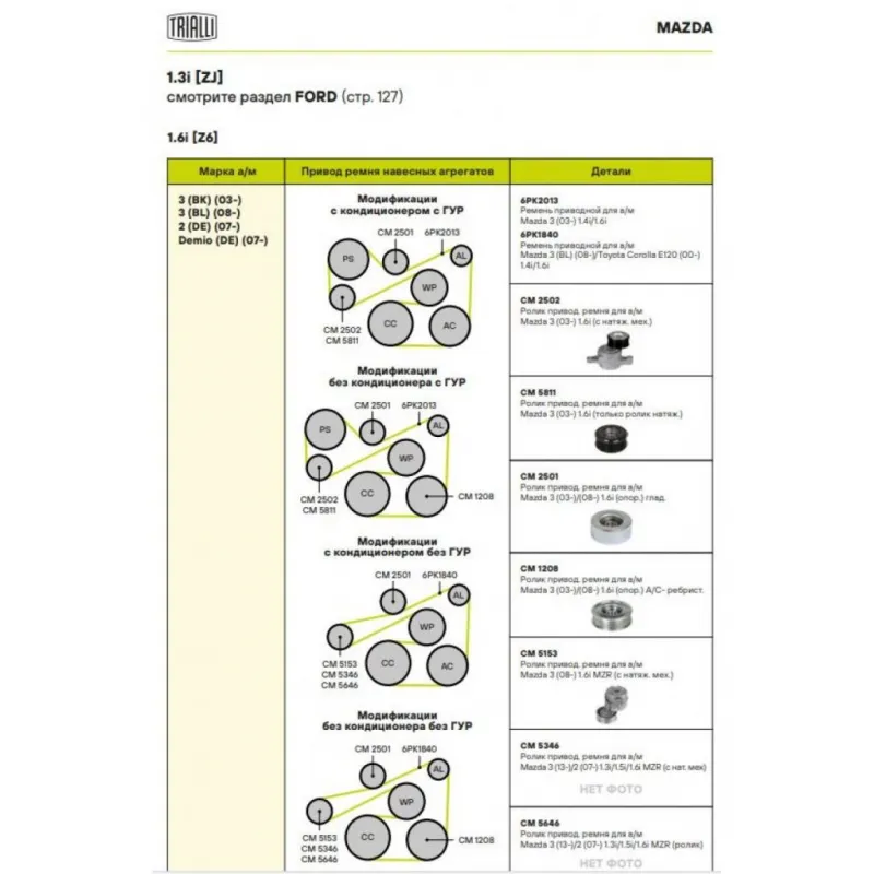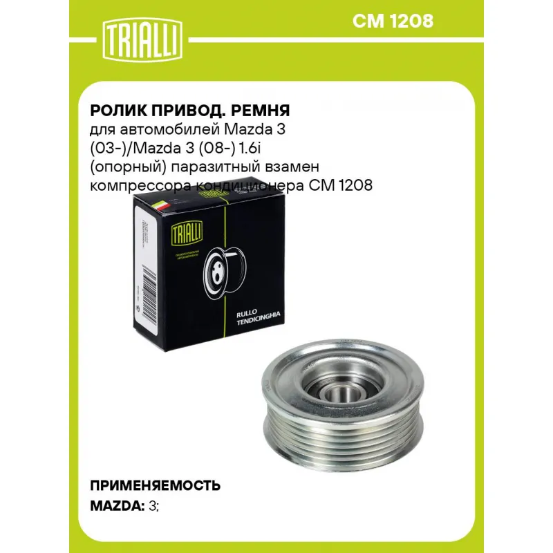 Ролик привод. ремня для автомобилей Mazda 3 (03-)/Mazda 3 (08-) 1.6i (опорный) паразитный взамен компрессора кондиционера Характеристики: Артикул: CM 1208 OEM номера: Z601-15-940, Z601-15-930A Количество на автомобиль: 1 Сопутствующие товары:: CM 2502, CM 5811, CM 2501, CM 5153, CM 5346, CM 5646, 6PK2013, 6PK1840 Внешний диаметр, мм: 79 Внутренний диаметр, мм: 17 Ширина, мм: 25 Гарантийный срок: 2 года/60 000 км. Материал: Комбинированный Товарная линейка: BLACK Комплектация: Ролик приводного ремня - 1 шт Гарантия: от 1 года.