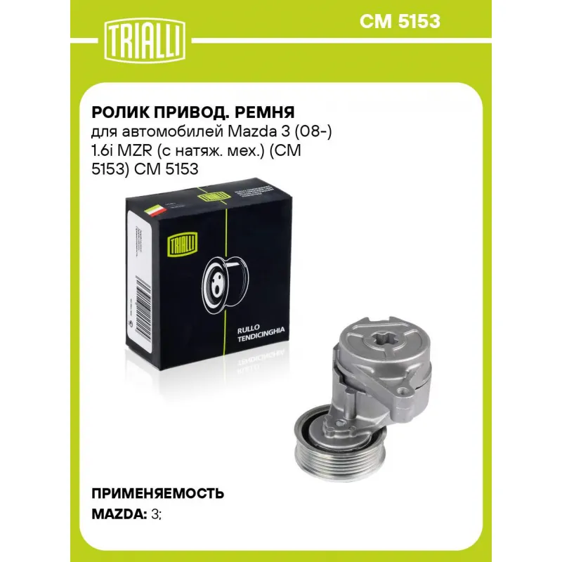 Ролик привод. ремня для автомобилей Mazda 3 (08-) 1.6i MZR (с натяж. мех.) (CM 5153) Характеристики: Артикул: CM 5153 OEM номера: Z60115980B, Z60115980C, Z60115980D Сопутствующие товары:: CM 2502, CM 5811, CM 2501, CM 1208, CM 5346, CM 5646, 6PK2013, 6PK1840 Количество на автомобиль: 1 Внешний диаметр, мм: 79 Ширина, мм: 28 Гарантийный срок: 2 года/60 000 км. Материал: металл/пластик Товарная линейка: BLACK Комплектация: Ролик привод. ремня с натяж. мех. - 1 шт Гарантия: от 1 года.