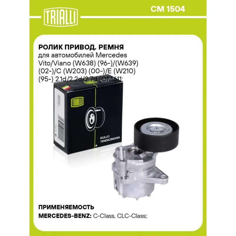 Ролик привод. ремня для автомобилей Mercedes Vito/Viano (W638) (96-)/(W639) (02-)/C (W203) (00-)/E (W210) (95-) 2.1d/2.2d/2.7d [OM611; OM646; OM647; OM648] (с натяж. мех.) (CM 1504) Характеристики: Артикул: CM 1504 OEM номера: 5080241AA, 0508241AA, 5080243AA, 05080241AB, A6462000570, A6112000570, A6112000470, A6112000370, A6112000270, 68001 798AA, 6112000270, A6462000270, A6112020019, A68001798AA, 6462000570, 6462000270, 6112020019, 6112000570S1, 6112000470, 6112000370, 6112000570, 68001798AB, 05080243AA Количество на автомобиль: 1 Сопутствующие товары:: CM 1802, CM 5599, 6PK2271, 6PK2160, 6PK2390, 6PK2196, 6PK280, 6PK2065 Внешний диаметр, мм: 70 Внутренний диаметр, мм: 7 Ширина, мм: 26 Гарантийный срок: 2 года/60 000 км. Материал: Комбинированный Товарная линейка: BLACK Комплектация: Ролик привод. ремня с натяж. мех. - 1 шт Гарантия: от 1 года.
