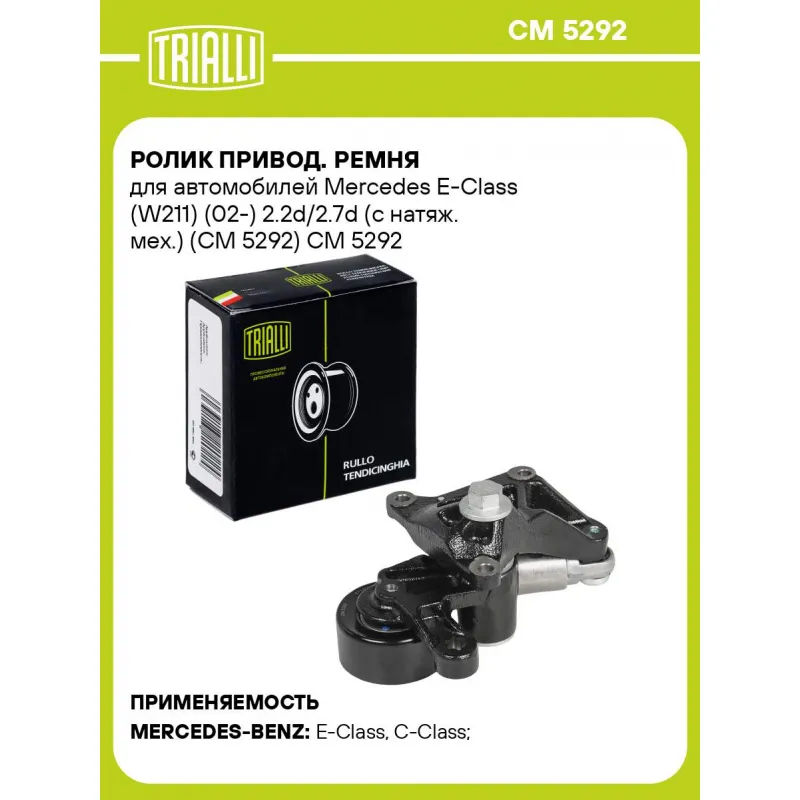 Ролик привод. ремня для автомобилей Mercedes E-Class (W211) (02-) 2.2d/2.7d (с натяж. мех.) (CM 5292) Характеристики: Артикул: CM 5292 OEM номера: A6112000670, 6462000070, 6462000470, A6462000070, A6462000470 Ширина, мм: 26,5 Количество на автомобиль: 1 Внешний диаметр, мм: 65 Гарантийный срок: 2 года/60 000 км. Материал: Комбин... Читать полностью →