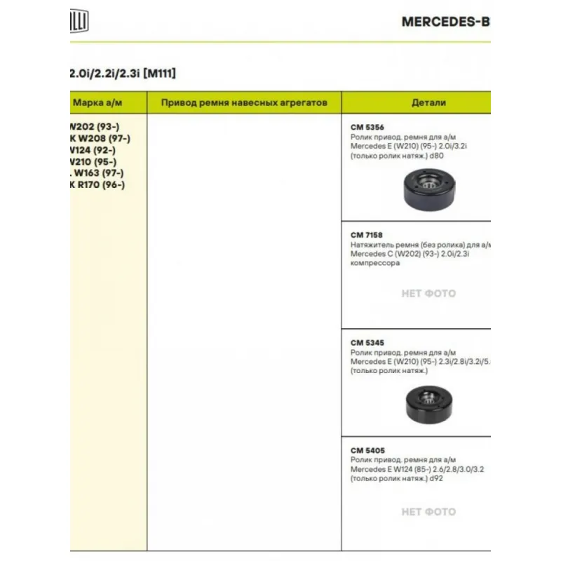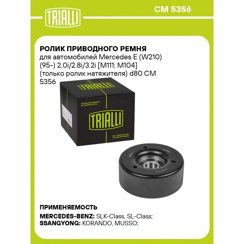 Ролик приводного ремня для автомобилей Mercedes E (W210) (95-) 2.0i/2.8i/3.2i [M111; M104] (только ролик натяжителя) d80 Характеристики: Артикул: CM 5356 OEM номера: A1042001070, 1042001070, 1622003070 Сопутствующие товары:: CM 5405, CM 5405, CM 5317, CM 5986, CM 5417, CM 5987, CM 5392, 6PK2415, 6PK2445, 6PK2380, 8PK2450, 6PK2257, 6PK2285, 6PK2330, 6PK2360, 6PK2175, 6PK2205 Количество на автомобиль: 1 Внешний диаметр, мм: 80 Внутренний диаметр, мм: 15 Ширина, мм: 31 Гарантийный срок: 2 года/60 000 км. Материал: Металл Товарная линейка: BLACK Комплектация: Ролик приводного ремня - 1 шт Гарантия: от 1 года.