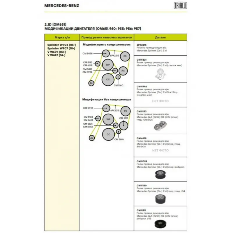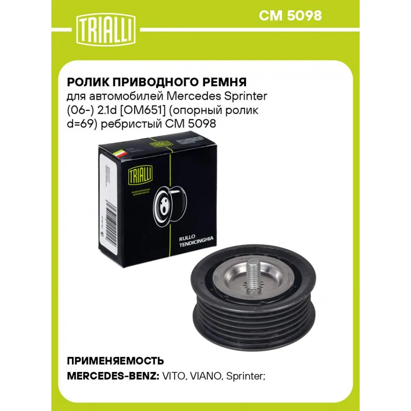 Ролик приводного ремня для автомобилей Mercedes Sprinter (06-) 2.1d [OM651] (опорный ролик d=69) ребристый Характеристики: Артикул: CM 5098 OEM номера: A6512000670, 6512000670, 11927HG00B Количество на автомобиль: 1 Внешний диаметр, мм: 69 Внутренний диаметр, мм: 8 Ширина, мм: 27 Гарантийный срок: 2 года/60 000 км. Товарная линейка: BLACK Комплектация: Ролик приводного ремня - 1 шт Гарантия: от 1 года.