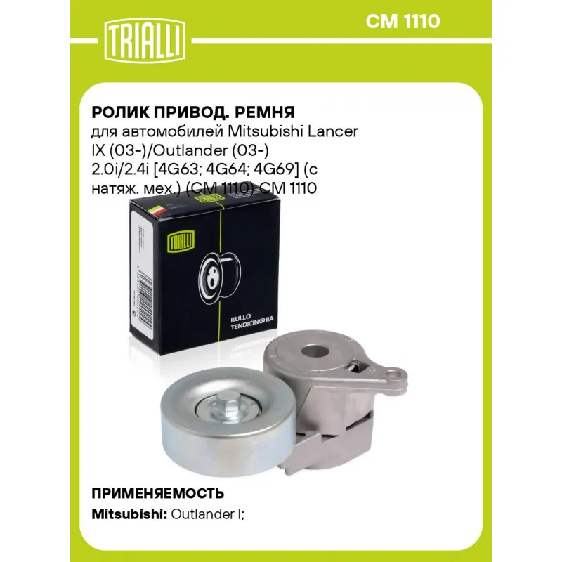 Ролик привод. ремня для автомобилей Mitsubishi Lancer IX (03-)/Outlander (03-) 2.0i/2.4i [4G63; 4G64; 4G69] (с натяж. мех.) (CM 1110) Характеристики: Артикул: CM 1110 OEM номера: MN149179, MD373939 Количество на автомобиль: 1 Внешний диаметр, мм: 80 Особенности конструкции:: механизм натяжения приводного ремня Ширина, мм: 28.5 Гарантийный срок: 2 года/60 000 км. Материал: Комбинированный Товарная линейка: BLACK Подходит для авто: Mitsubishi Outlander I (03-) Для проверки применяемости отправьте VIN автомобиля через вкладку "Есть вопросы о товаре?" Комплектация: Ролик натяж. ремня - 1 шт Гарантия: от 1 года.