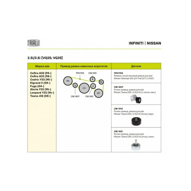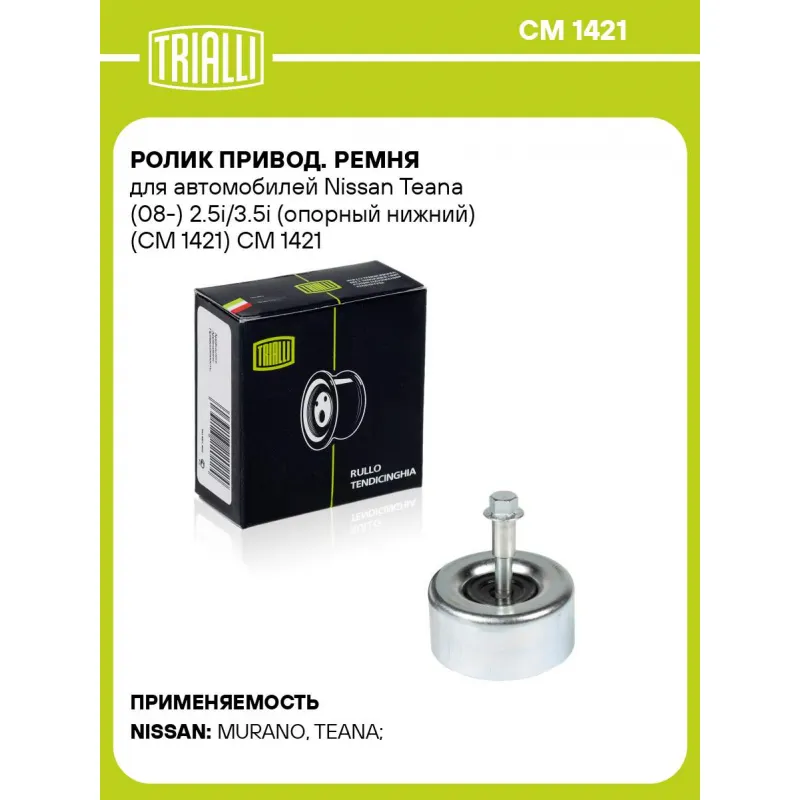 Ролик привод. ремня для автомобилей Nissan Teana (08-) 2.5i/3.5i (опорный нижний) (CM 1421) Характеристики: Артикул: CM 1421 OEM номера: 11925JA11A Количество на автомобиль: 1 Внешний диаметр, мм: 75 Внутренний диаметр, мм: 10 Ширина, мм: 36 Гарантийный срок: 2 года/60 000 км. Материал: Металл Товарная линейка: BLACK Комплекта... Читать полностью →