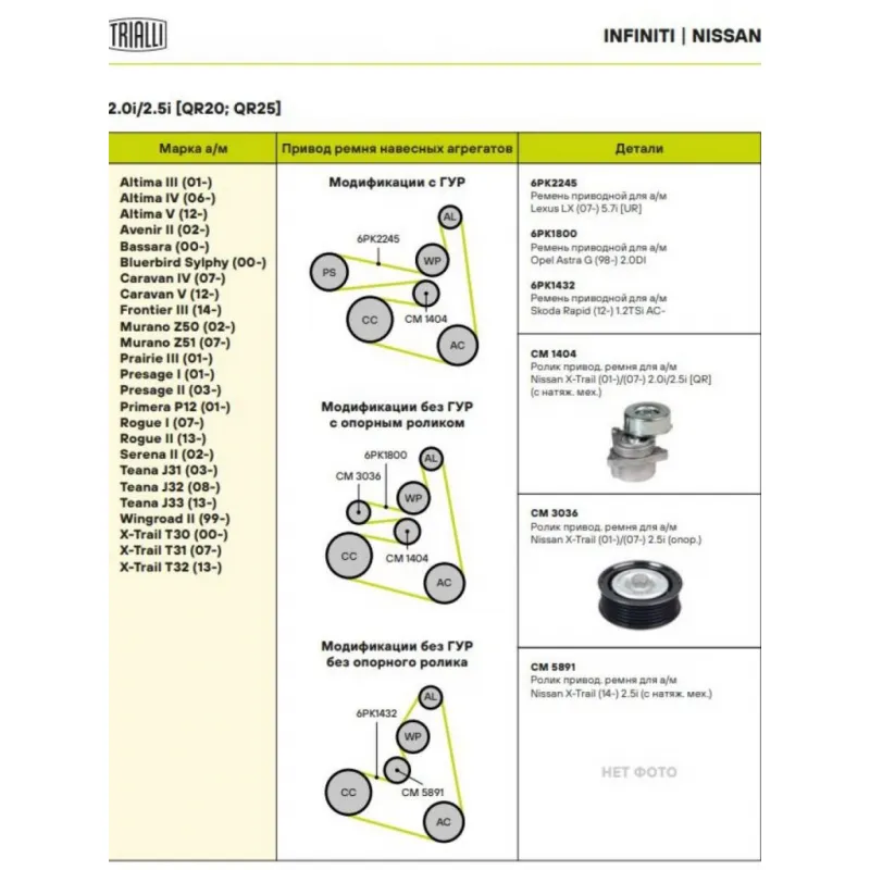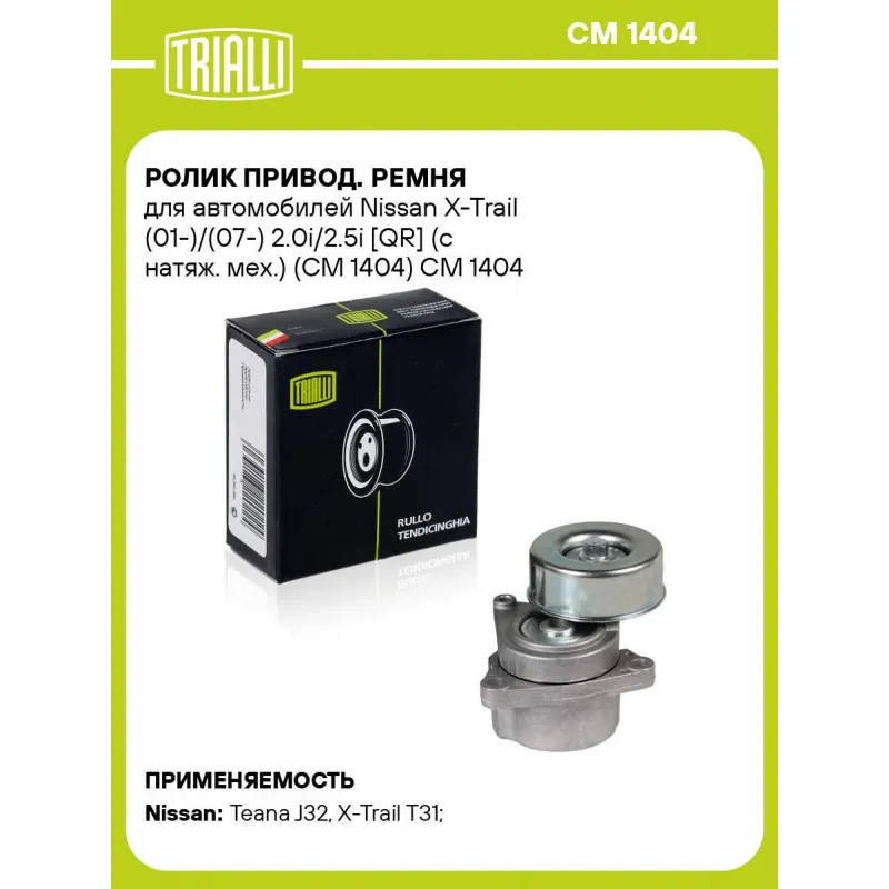 Ролик привод. ремня для автомобилей Nissan X-Trail (01-)/(07-) 2.0i/2.5i [QR] (с натяж. мех.) (CM 1404) Характеристики: Артикул: CM 1404 OEM номера: 11955-JA00A, 119556N202, 119556N20B, 119556N20C, 119558J00A, 11955JA00D, 119556N20A, 11955-8J000, 11955-JA00C, 11955JA00B Количество на автомобиль: 1 Внешний диаметр, мм: 82 Особенности конструкции:: механизм натяжения приводного ремня Ширина, мм: 30 Гарантийный срок: 2 года/60 000 км. Материал: Комбинированный Товарная линейка: BLACK Подходит для авто: Nissan Teana J32 (08-), X-Trail T31 (07-), Primera P12 (02-) Для проверки применяемости отправьте VIN автомобиля через вкладку "Есть вопросы о товаре?" Комплектация: Ролик приводного ремня - 1 шт Гарантия: от 1 года.
